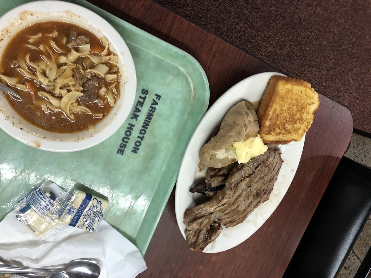 This place is a gem! Love the old decor everything from the model cars on display down to the trays that read Farmington Steak House. Love the older but clean look inside IDK how to explain it kinda it’s like a beautiful time capsule. Yes I occasionally enjoy a fancy $50 steak in a fancy restaurant, but this is very special in its own way. Please keep it the way it is and never remodel it for as long as possible. Tastes great especially for that price (paid roughly $22 for the meal shown). Friendly family owned and operated restaurant.