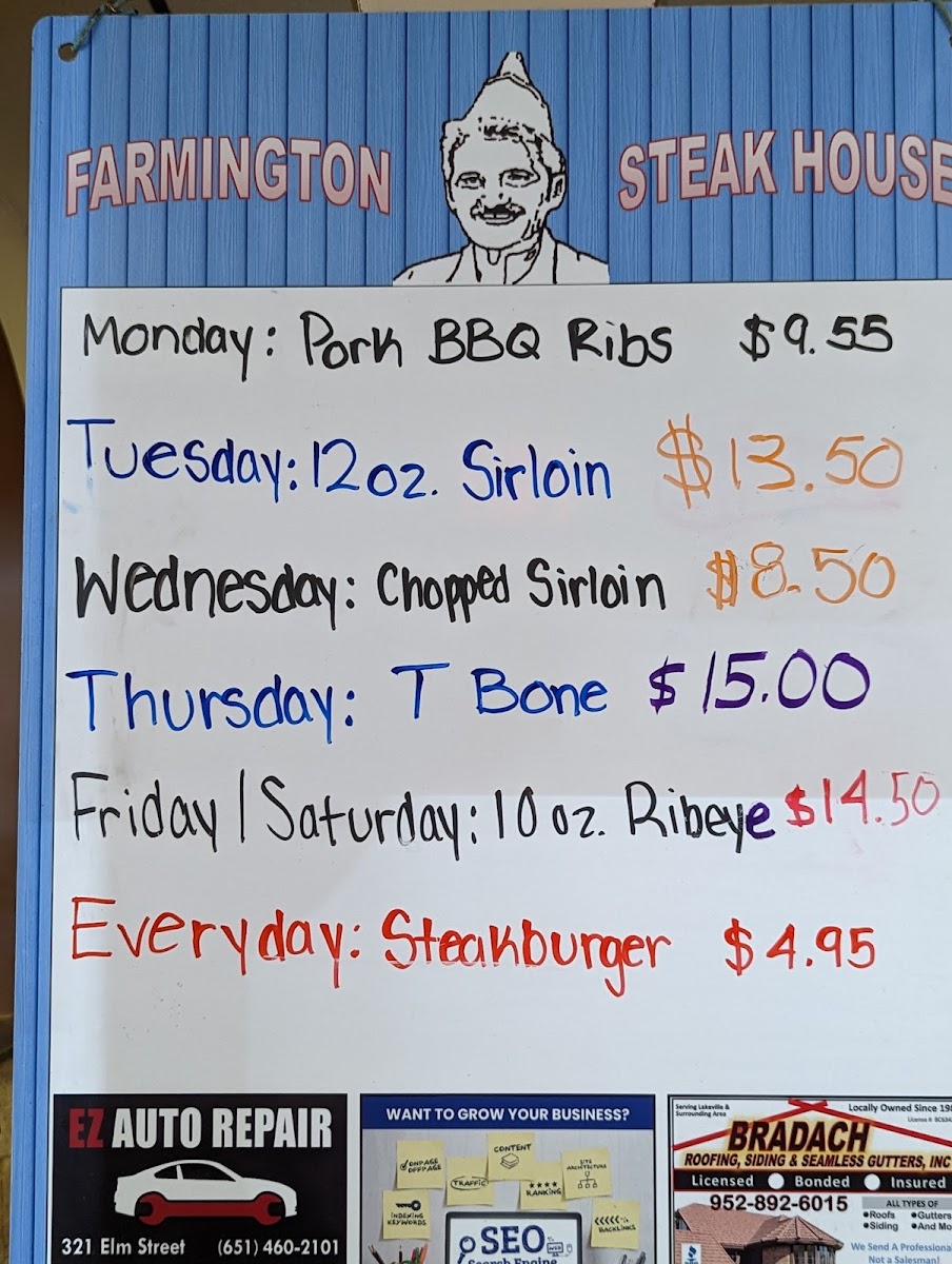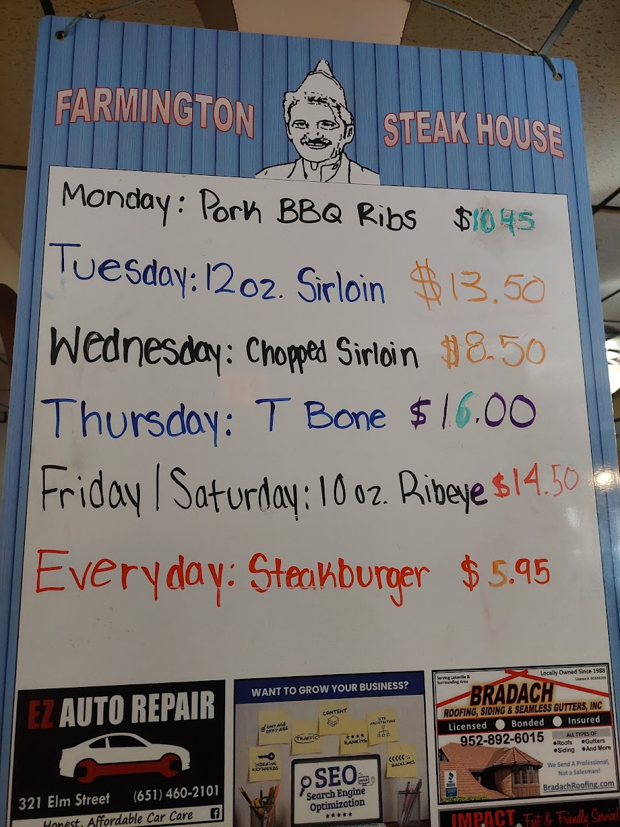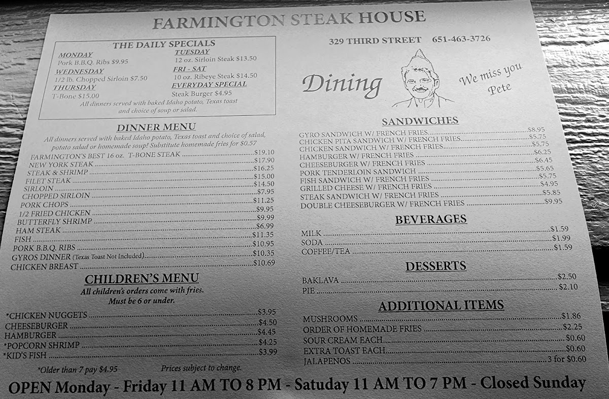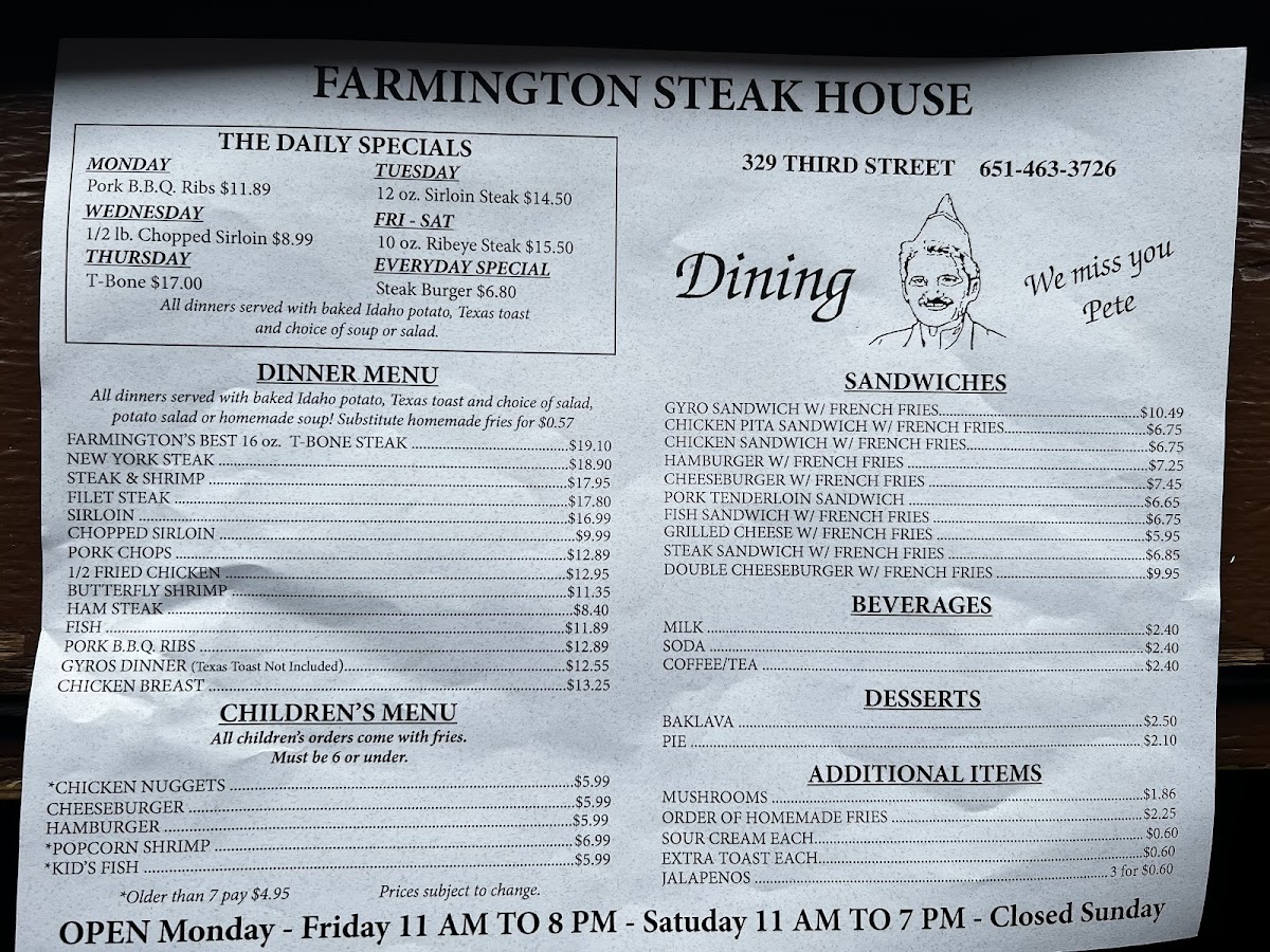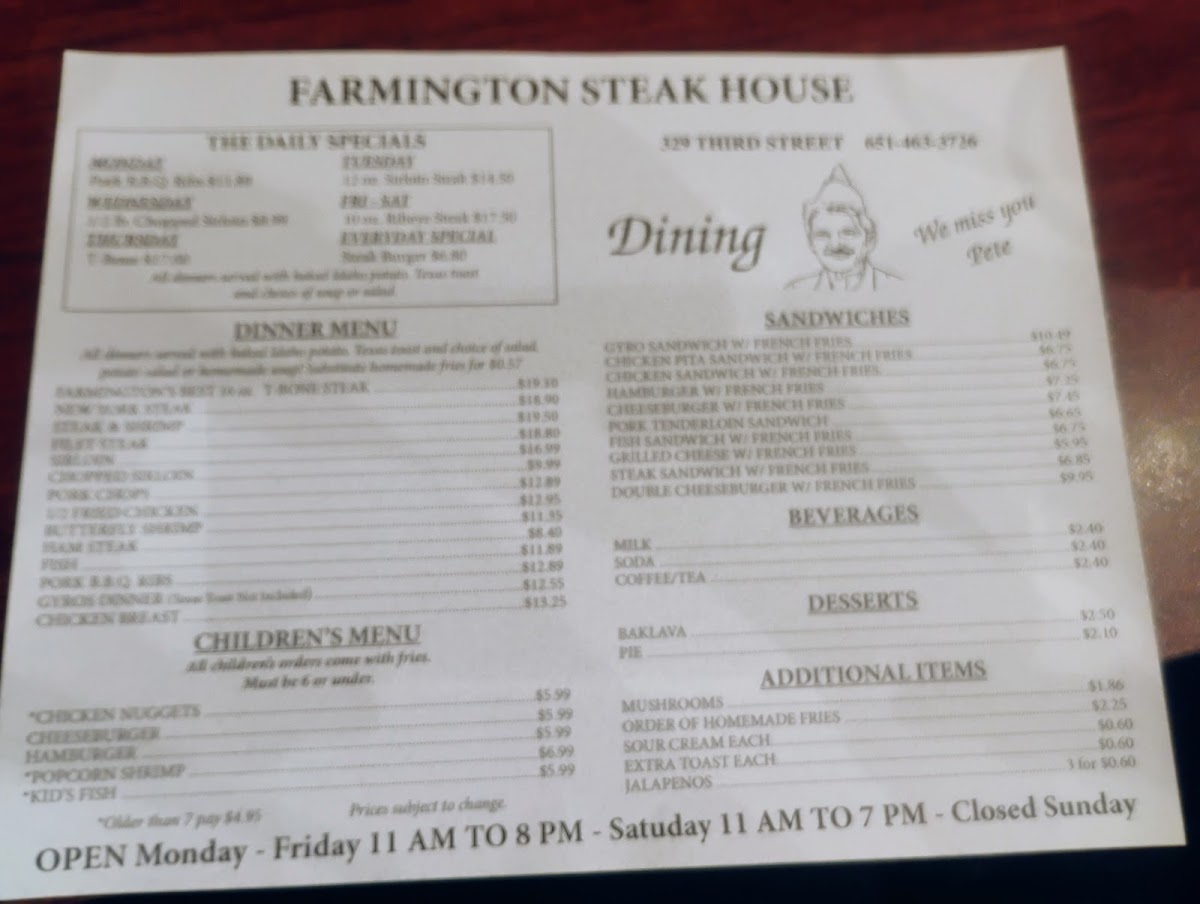 The menu at Farmington Steak House reflects a straightforward, comforting approach to dining with a focus on hearty American and Greek-inspired dishes. It offers a range of satisfying options from classic steak dinners to casual sandwiches and family-friendly plates, all served in a relaxed, welcoming setting.